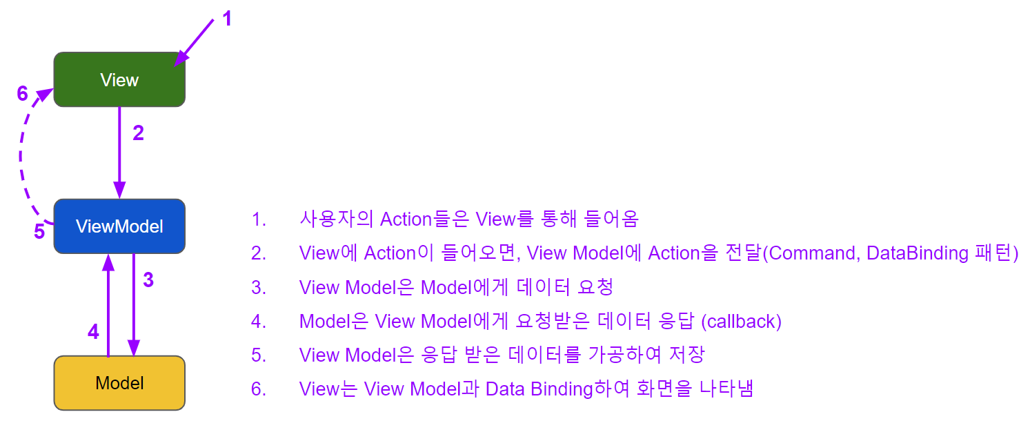 MVVM은 Model + View + View Model를 합친 용어입니다.