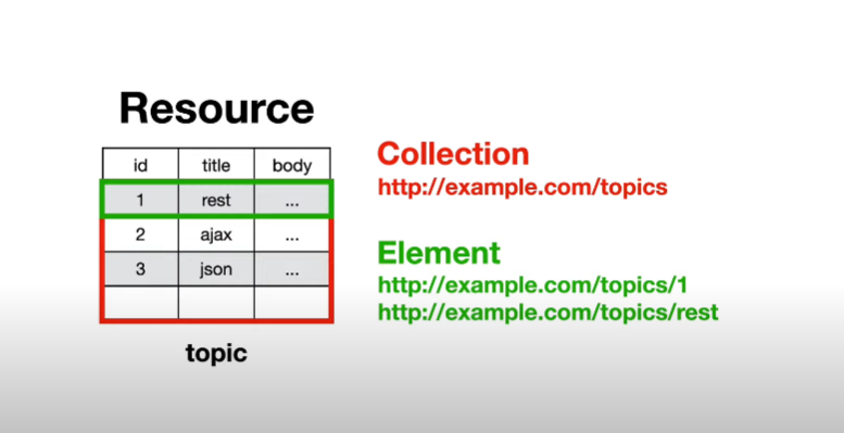 한건한건의 토픽을 엘리먼트라고한다. 엘리먼트가 모여 컬렉션이 된다. 아이디값을 사용하는게 일반적이다. 1 처럼. 그리고 rest 처럼 문자로도 표현 가능하다.